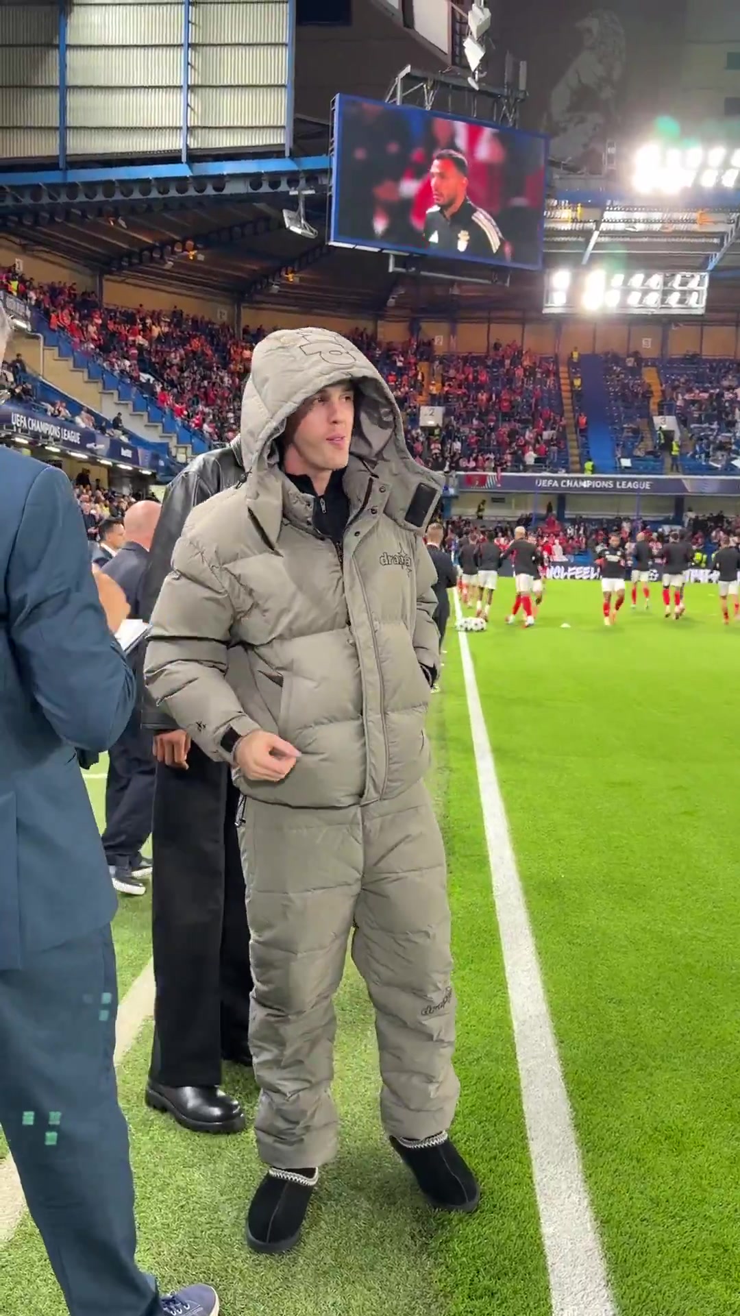 联赛阶段切尔西1-0击败本菲卡,帕尔默现身斯坦福桥球场,穿着大棉衣+棉鞋看比赛。